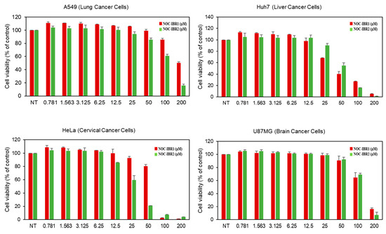Lung cancer cells (A549), liver cancer cells (Huh7), cervical cancer cells (HeLa), brain cancer cells (U87MG), and a normal cell line (human keratinocyte cell line (HaCaT)) were acquired from the Korean Cell Line Bank (Seoul, Republic of Korea). Ten percent fetal bovine serum (FBS) was added to Dulbecco’s modified Eagle’s medium (DMEM) to culture the HeLa A549 cells. Similarly, Huh7 cells were grown in DMEM obtained from Corning Cellgro Manassas, VA, USA. Glioblastoma U87MG cells were cultured in a minimum essential medium (MEM) supplemented with 10% FBS. DMEM supplemented with 10% FBS, 100 µg/mL streptomycin, and 100 µg/mL benzylpenicillin was used to grow HaCaT cell lines. Each cell line was kept in an incubator with 5% CO2 that was humidified at 37 °C (Thermo Scientific, Vantaa, Finland). For the cell growth assays, various cancer cells at 2 × 103 cells/well were plated in 96-well culture plates. NOC-IBR1 and NOC-IBR2 were added to each well at various concentrations (200 μM, 100 μM, 50 μM, 25 μM, 12.5 μM, 6.25 μM, 3.16 μM, 1.56 μM, and 0.78 μM), and the cells were incubated for 72 h. A 3-(4,5-dimethylthiazol-2-yl)-2,5-diphenyltetrazolium bromide (MTT) colorimetric assay was used to measure cell growth (cell viability).