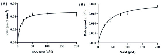 Enzyme-kinetic characteristics of ThnM3. (A) Kinetic analysis using various concentrations of NOC−IBR1 (5–200 µM), ThnM3 (5 µg), SAM (2 mM), and Tris-HCl buffer (50 mM, pH 7.5). (B) Kinetic analysis using various concentrations of SAM (5–200 µM), ThnM3 (5 µg), NOC−IBR1 (100 µM), and Tris-HCl buffer (50 mM, pH 7.5).
