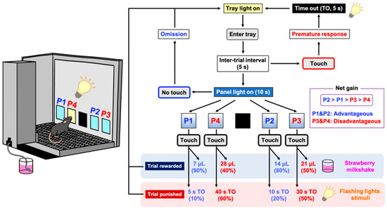 Schematic representation of a touchscreen-based Iowa Gambling Task (IGT). Each trial began with mice entering the lit food tray. After an inter-trial interval (ITI) of 5 s, all four windows (P1–P4) were illuminated simultaneously for 10 s. A premature response was recorded by mice touching any cue window during the ITI and resulted in a 5 s time out (TO). An omission was recorded when mice made no response to cue windows at all. If the trial was rewarded (win), then the appropriate volume of reward (strawberry milkshake) was delivered. If the trial was punished (loss) then the image touched flashed for the designated TO period. The reward/punishment ratio of each window was programmed differently in P1–P4. Two choices (P1, P2) resulted in the delivery of small rewards and low punishments, which led to an advantageous outcome. In contrast, the other two choices (P3, P4) resulted in the delivery of high rewards and high punishments, which led to a disadvantageous outcome. Mice completed the task either within 100 trials or within 30 min, whichever occurred first.