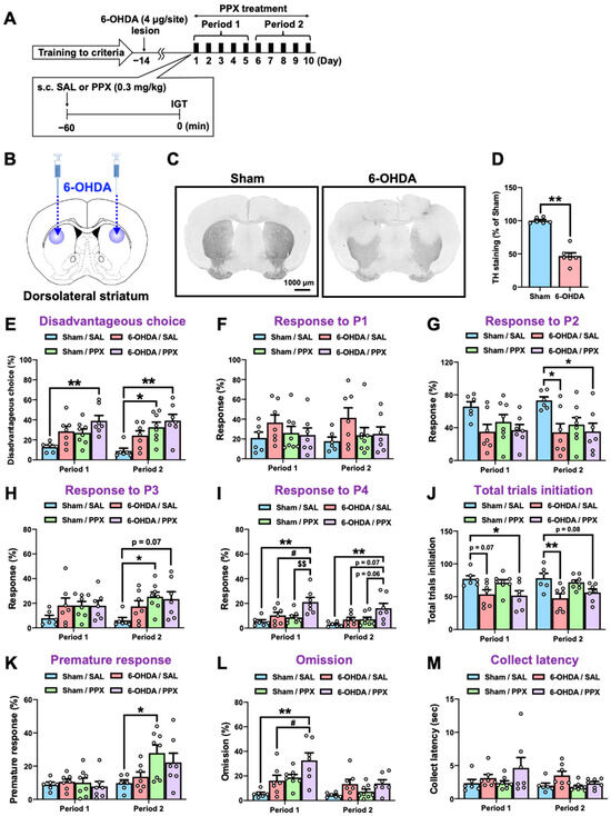 Effect of PPX treatment on decision-making in sham- and 6-OHDA-lesioned mice. (A) Experimental schedule. Following the fulfillment of criteria in IGT training, sham- or 6-OHDA-lesioned mice were administered with PPX (0.3 mg/kg) for 10 days, and their decision-making, motor impulsivity, attention, and motivation were assessed by the IGT over two distinct periods: the initial 5 days (Period 1) and the subsequent 5 days (Period 2). (B–D) Dopaminergic denervation in 6-OHDA-lesioned mice was evaluated. (B) The injection site of 6-OHDA. (C) Bright-field microscopic images of TH-positive cells. Scale bar = 1000 μm. (D) The density of TH-positive cells in the STR was analyzed. Each column represents the mean ± SEM (n = 6–7). ** p < 0.01 versus sham. (E–M) Decision-making was evaluated by the percentage of (E) disadvantageous choice, (F) response to P1, (G) response to P2, (H) response to P3, and (I) response to P4. The degree of session completion was shown as the number of (J) total trials initiation. Motor impulsivity was evaluated using (K) the percentage of premature response. Inattention and motivation were evaluated using (L) the percentage of omission or (M) latency to collect rewards. Each column represents the mean ± SEM (n = 6~8). * p < 0.05, ** p < 0.01 versus sham/SAL. # p < 0.05 versus 6-OHDA/SAL. $$ p < 0.01 versus Sham/PPX. IGT, Iowa Gambling Task; 6-OHDA, 6-hydroxydopamine; SAL, saline; PPX, pramipexole; STR, striatum; TH, tyrosine hydroxylase.