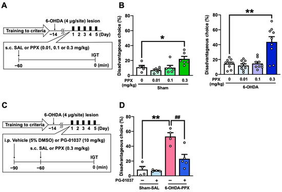 Effect of D3R antagonist on PPX-induced decision-making impairment in 6-OHDA-lesioned mice. (A,B) Dose–response relationship of PPX-induced impairment of decision-making. (A) Experimental schedule. After meeting the criteria of the IGT training, sham- and 6-OHDA-lesioned mice were administered PPX (0.01, 0.1 or 0.3 mg/kg) for 5 days, and their decision-making was assessed using (B) the percentage of disadvantageous choices in the IGT. Each column represents the mean ± SEM (n = 5~9). * p < 0.05, ** p < 0.01 versus PPX (0 mg/kg). (C,D) Effect of D3R antagonist on PPX-induced decision-making impairment in 6-OHDA-lesioned mice. (C) Experimental schedule. Sham- or 6-OHDA-lesioned mice were co-administered PG-01037 (10 mg/kg) and PPX (0.3 mg/kg) for 5 days, and their decision-making was assessed using (D) the percentage of disadvantageous choices in the IGT. Each column represents the mean ± SEM (n = 4~5). ** p < 0.01 versus sham-SAL/vehicle. ## p < 0.01 versus 6-OHDA-PPX/vehicle. IGT, Iowa Gambling Task; 6-OHDA, 6-hydroxydopamine; SAL, saline; PPX, pramipexole.