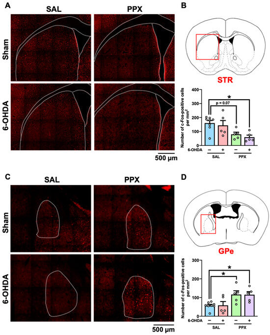 We mapped the brain regions associated with PPX-induced impairments of decision-making by measuring c-Fos-positive cells in the brains of PPX-treated sham- and 6-OHDA-lesioned mice. Brain samples were collected 2 h after performance of the IGT on the last day of Period 2 (Figure 4, Table S1). Our findings indicate an overall decrease in the number of c-Fos-positive cells in the STR of both sham- and 6-OHDA-lesioned mice treated with PPX (Figure 4A,B). However, an increase in the number of c-Fos-positive cells was observed in the GPe of both sham- and 6-OHDA-lesioned mice treated with PPX (Figure 4C,D). Significant main effects of PPX on the number of c-Fos-positive cells were observed in several brain regions, including in the intermediate part of the lateral septum (LS), CA1-3, and dentate gyrus subregions of the hippocampus (HIP) and Th, in both sham- and 6-OHDA-lesioned mice treated with PPX (Table S1). The changes in c-Fos-positive cells induced by PPX treatment between sham- and 6-OHDA-lesioned mice were comparable (Figure 4, Table S1).