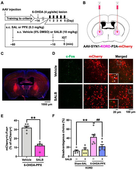 Based on the c-Fos mapping results, we hypothesized that neural circuit dysfunctions in the STR-GPe or HIP-LS pathway may be associated with the PPX-induced decision-making impairments in 6-OHDA-lesioned mice [13,23,24,25]. In order to manipulate these brain areas, we used a κ-opioid receptor-based DREADD (KORD) coupled to the G-protein Gi, which can be activated by the specific ligand salvinorin B (SALB) [26]. Prior to the IGT training, we bilaterally injected AAV-SYN1-KORD-P2A-mCherry into the GPe or LS of mice (Figure 5A,B and Figure S2A,B). We confirmed that SALB administration significantly reduced the percentage of double-positive cells for both mCherry and c-Fos in the GPe of 6-OHDA-lesioned mice treated with PPX, demonstrating the inhibitory effect of KORD on neuronal activity (Figure 5C–E). We next investigated the effect of KORD-mediated inhibition of the GPe or LS on PPX-impaired decision-making in 6-OHDA-lesioned mice. Treatment with SALB in 6-OHDA-lesioned mice expressing KORD in the GPe, but not in the LS, suppressed PPX-induced potentiation of disadvantageous choices (Figure 5F and Figure S2D). These findings strongly suggest that hyperactivation of the GPe is responsible for PPX-induced impairment of decision-making in 6-OHDA-lesioned mice.