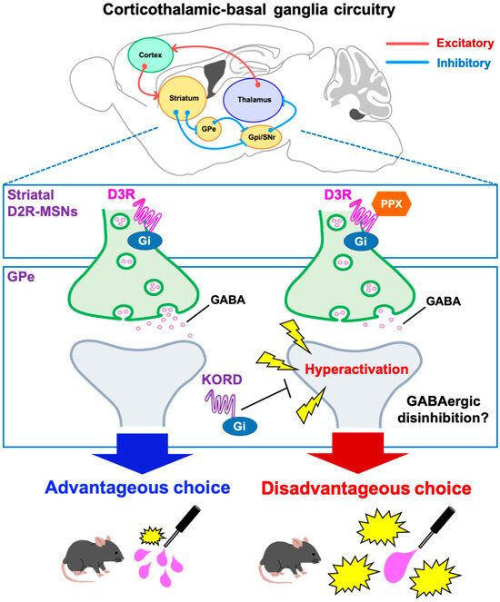 Our study reveals new insights into the neural circuit mechanisms of the GPe within the STR and basal ganglia loops. The corticothalamic-basal ganglia circuitry is primarily divided into motor, associative, and limbic loops [27,28], where the GPe serves as a relay nucleus, receiving GABAergic inputs from striatal D2R-MSNs in the indirect pathway, which express the Gi-coupled D3R [15]. Evidence from primate studies indicates that GPe subregions have specific roles in movement, action selection, and motivation via connections with distinct regions of the cortex and Th [29]. In this study, the suppression of neuronal activity specifically in the STR suggests that PPX acts at D3Rs on striatal D2R-MSNs, leading to GABAergic disinhibition within the STR and hyperactivation of the GPe (Figure 4 and Figure 6) in the indirect pathway. We found that KORD-mediated inhibition of the GPe ameliorated PPX-induced disadvantageous choices in 6-OHDA-lesioned mice (Figure 5F), suggesting that GPe hyperactivation impairs decision-making by interfering with the learning of negative outcomes, as has been observed in PD patients treated with PPX [30,31].