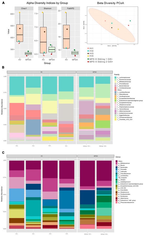 Analysis of gut microbiota in healthy volunteers (HVs) and patients with Sanfilippo syndrome (MPS III). (A) The alpha diversity, Chao1, Shannon, and Faith PD indexes and the principal coordinates analysis (PCoA) plot of Bray−Curtis beta diversity are shown. Microbial composition was analyzed by 16S rRNA amplicon sequencing of feces from 4 HVs and the MPS III siblings included in the study. Relative abundance of families (B) and the 20 most abundant genera (C). f__, family; GIS, gastrointestinal symptoms; g__, genus.