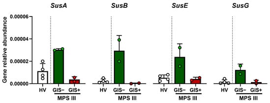 Relative abundance of PUL (SusA, SusB, SusE, and SusG) genes assessed by qPCR from stool samples of MPS III siblings and healthy volunteers. GIS, gastrointestinal symptoms; HV, healthy volunteers; MPS III, Sanfilippo syndrome siblings. Each dot represents the average of 3 technical replicates and bars are expressed as mean ± SD. HV, n = 4 stool samples from 4 different healthy volunteers; GIS+, n = 2 two different day samples from the GIS+ MPS III patient.; GIS−, n = 2 two different day stool samples from the GIS+ MPS III patient.