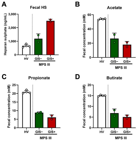 Fecal levels of heparan sulfate (HS) (A), acetate (B), propionate (C), and butyrate (D) were determined by ELISA and gas chromatography coupled with mass spectrometry (GC-MS), respectively. Each dot represents the average of 3 technical replicates and bars are expressed as mean ± SD. HV, n = 4 stool samples from 4 different healthy volunteers; GIS+, n = 2 two different day samples from the GIS+ MPS III patient.; GIS−, n = 2 two different day stool samples from the GIS+ MPS III patient. GIS, gastrointestinal symptoms; HV, healthy volunteers; MPS III, Sanfilippo syndrome siblings.