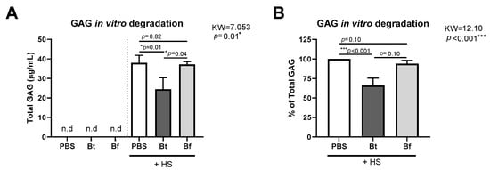 HS degradation activity of bacteria isolated from the stool of MPS III patients. Bacteroides spp. strains were isolated from stool samples of the two MPS III siblings included in this study. Bacteria were cultured in the presence of 75 µg/mL of HS at 37 °C under anaerobic conditions for 48 h. (A) Total GAG in the culture supernatant determined using the 1,9-dimethylmethylene blue procedure is shown. (B) Percentage of total GAG normalized to the PBS control. Bf, Bacteroides fragilis; Bt, Bacteroides thetaiotaomicron; n.d., not detected. KW, Kruskal–Wallis statistic; * p-value < 0.05 and *** p-value < 0.001 analyzed using the Kruskal–Wallis ANOVA test followed by Dunn’s multiple comparisons test. Data are expressed as mean ± SD from n = 4 independent experiments.