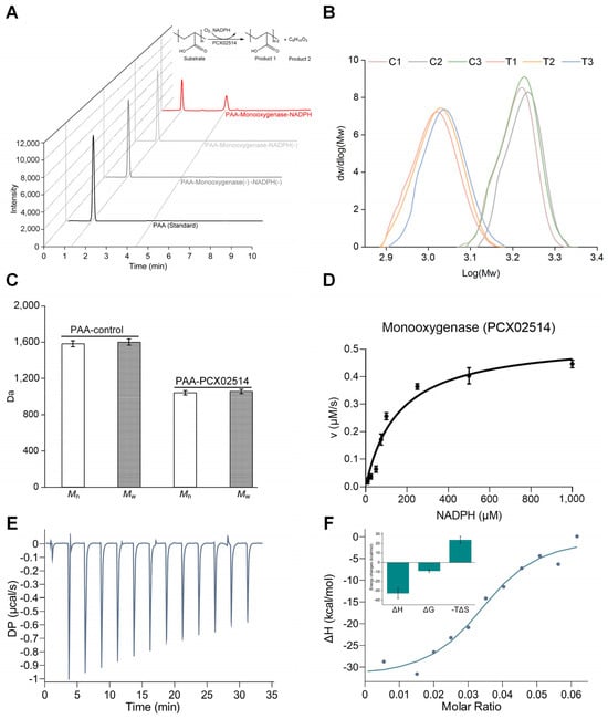 Biochemical analyses of monooxygenase PCX02514. (A) HPLC–MS elution chromatograms for PAA–PCX02514–NADPH. (B) Molecular weight distribution curves of PAA. C1, C2, and C3: PAA–control group; T1, T2, T3: PAA–PCX02514 group. (C) Molecular weight of PAA in the PAA–control group and PAA–PCX02514 group. (D) Enzyme kinetic assay for monooxygenase PCX02514. (E,F) ITC profiles of the interaction between PAA and PCX02514. PAA: 120 μM, PCX02514: 40 μM, Buffer: PBS (pH 7.4, containing 100 μM NADPH). The inlet of (F) reflects the changes in enthalpy (ΔH,) Gibbs free energy (ΔG), and entropy (ΔS).