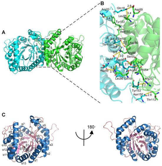 Overall structure of monooxygenase PCX02514. (A) Cartoon diagram showing the overall structure of monooxygenase PCX02514. Chain A and chain B of the dimer are shown in cyan and green, respectively. (B) Stereo view of the ribbon–stick model showing the detailed binding interface between chain A and chain B. Bonds involved in the interactions are shown as dotted lines. (C) Cartoon diagram showing the monomer structure of monooxygenase PCX02514. The α-helix, β-sheet, and loops are shown in blue, light pink, and salmon, respectively.