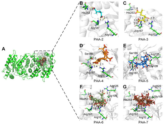 Active sites of monooxygenase PCX02514. (A) Active pocket surface model of monooxygenase PCX02514. (B–G) Enlarged views of the active sites of monooxygenase PCX02514. Residues that interacted with PAAs are shown as green sticks. The bonds involved in the interactions were shown as dotted lines.