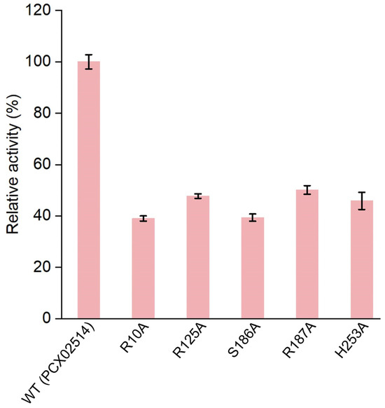 Based on molecular docking results, key amino acids that interacted with PAAs were identified (i.e., Arg10, Arg125, Ser186, Arg187, and His253). Subsequently, by combining key amino acid mutations, five mutants (R10A, R125A, S186A, R187A, and H253A) were obtained to verify the catalytic sites of monooxygenase PCX02514. The five mutants were expressed and purified (Figure S9), and their relative enzyme activities were measured (Figure 5). Similar to the monooxygenase from Aspergillus flavus, the active site arginine is crucial for positioning and guiding the cofactor and substrate during catalysis [35]. In this study, the mutants R10A, R125A, and R187A exhibited a decrease in enzyme activity. This reduced activity might be due to Arg10, Arg125, and Arg187 being alkaline amino acids that attracted multiple carboxyl groups in PAA to move toward the active pocket, ultimately forming hydrogen bonds. However, the functions of the active sites Ser186 and His253 in the catalytic activity of monooxygenase PCX02514 have not previously been reported. Compared with the wild-type monooxygenase PCX02514, the mutant S186A exhibited more than 50% reduced activity, indicating that the mutation of this residue at the active site partially abolished the activity of monooxygenase PCX02514. The active site Ser186 might be related to stabilizing the transition state, thereby promoting the catalytic function of monooxygenase PCX02514. The enzyme activity of mutant H253A also decreased, suggesting that the His253 residue might play an important role in the monooxygenase-mediated catalysis of PAA. The small steric hindrance of His253 means the residue likely promoted the entry of substrates and the release of products. In summary, these results confirm the critical roles of residues Arg10, Arg125, Ser186, Arg187, and His253 in PAA degradation by monooxygenase PCX02514.