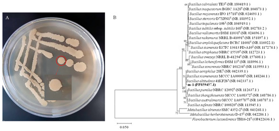 The 16S rRNA gene of strain m-1 was amplified using bacterial universal primers 27F and 1492R. The PCR amplification yielded a 1451 bp fragment. The DNA sequence was submitted to the GenBank database (accession No. PP859457). The nucleotide sequence of the m-1 16S rRNA gene showed high similarity (99.65% homology) to that of B. altitudinis strain 41KF2b (Figure 2B). Therefore, strain m-1 could be identified as belonging to B. altitudinis.