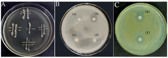 Similarly, the crude extract obtained after a fermentation period of 72 h and acid precipitation at pH 2.0 had a pronounced inhibitory effect on m-1, as evidenced by the formation of clear zones on the m-1 plates (Figure 3C). This finding indicated that the extraction process successfully concentrated the active inhibitory compounds, resulting in a more potent antimicrobial effect compared with that of the original fermentation broth.