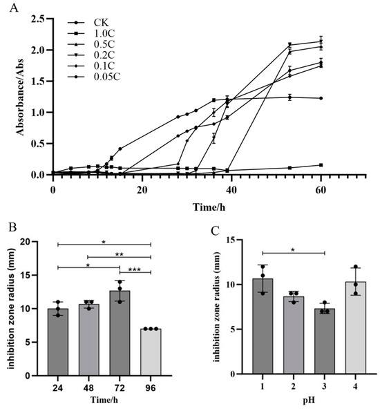 Growth curves of m-1, antibacterial activity, and optimization of the extraction. (A) Growth curves of m-1 cultures treated with different crude extract concentrations. The crude extract was diluted 1, 5, 10, and 20 times to generate the 0.5 C, 0.2 C, 0.1 C, and 0.05 C extracts, respectively; CK: no crude extract treatment. (B) Antibacterial activity of lipopeptide crude extracts. (C) Optimization of the pH for acid precipitation. * p < 0.05, ** p < 0.01, *** p < 0.001.
