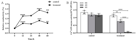 Conductivity and Ca2+-ATPase activity of m-1 treated with JZ crude extract. (A) Relative conductivity. Control: 9 mL PDB + 1 mL sterile water; treatment: 9 mL PDB + 1 mL 0.5 C crude extract. Significance represents the difference between the current and preceding time points. (B) Ca2+-ATPase activity. ** p < 0.01, *** p < 0.001, **** p < 0.0001.