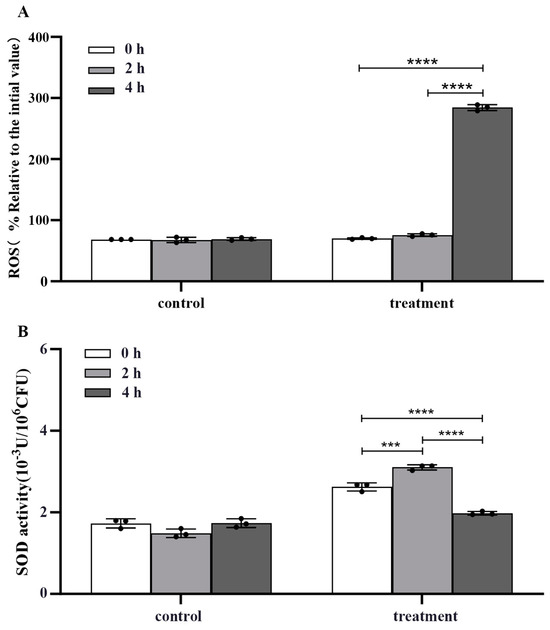 The m-1 was inoculated in PDB and incubated in a shaker at 37 °C and 120 rpm for 12 h. A total of 18 mL of the bacterial solution was divided in half into a control group and a treatment group. A total of 1 mL of sterile water was added to control and 1 mL of 10 times MIC crude extract was added to treatment, and the two groups were incubated in a shaker at 37 °C and 120 rpm. Samples were taken at 0 h, 2 h, and 4 h to determine the effect of the crude extract on the ROS of m-1. Samples were taken three times in parallel with control and treatment to minimize errors due to differences in the total number of cells in the two sets of samples.