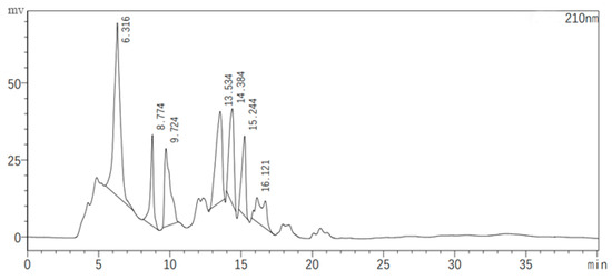 Figure 7 illustrates the chromatographic separation of seven classes of substances present in the JZ crude extract, with each peak representing a different sample collected at specific retention times. The antagonistic activity of these samples was evaluated, revealing that only the eluents corresponding to the second peak (8.774 min) and the fifth peak (14.384 min) exhibited inhibitory effects against bacterial growth. These active samples were then subjected to QTOF-MS/MS analysis for compound identification.