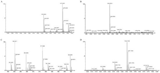 QTOF-MS/MS analysis of JZ crude extract. Spectra of (A) fengycin, (B) iturin, (C) bacillaene, (D) surfactin.