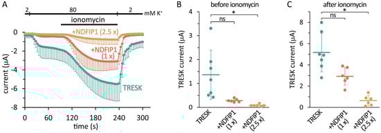 TRESK and different amounts of NDFIP1 cRNAs were coinjected into Xenopus laevis oocytes, and the resulting background potassium currents were examined three days later (Figure 1A). The currents were measured by the two-electrode voltage clamp method at −100 mV, and the basal TRESK current was calculated as a difference in extracellular solutions containing 2 or 80 mM [K+]. Since TRESK is typically regulated by calcineurin, the calcium ionophore ionomycin was applied during the measurement to increase cytoplasmic [Ca2+], stimulate the endogenous calcium-/calmodulin-dependent protein phosphatase, and activate TRESK by dephosphorylation [,,].