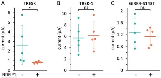 The reduction of the TRESK current by NDFIP1 suggests that there is a functional interaction between the two proteins. We asked whether this interaction is specific, since the overexpression of NDFIP1 was previously shown to disrupt the Golgi apparatus and interfere with the overall protein expression []. Therefore, we also tested the effect of NDFIP1 on two other potassium channel types under identical conditions, on the relatively closely related K2P channel TREK-1 (TWIK-related K+ channel 1, K2P2.1, KCNK2), and on a more distantly related K+ channel, GIRK4 (G protein-activated inward rectifier potassium channel 4, KIR3.4, KCNJ5). We used the S143T mutant version of GIRK4, as it can form functional homotetramers even in the absence of other GIRK subunits []. Our approach was to adjust the NDFIP1 expression to a level that inhibited TRESK, but did not affect TREK-1 or GIRK4. When the amount of NDFIP1 cRNA was two thirds of the quantity used in Figure 1, this microinjection was sufficient to significantly reduce the TRESK current (Figure 2A); however, TREK-1 and GIRK4 were not affected in the same oocyte preparation under identical conditions (Figure 2B,C). Therefore, it was possible to establish an appropriate NDFIP1 expression level for the specific regulation of TRESK, indicating that TRESK is more sensitive to NDFIP1 than TREK-1 and GIRK4. The TRESK current was reduced by a relatively low level of NDFIP1, which did not generally interfere with the functional expression of other channel proteins. In the following experiments, this amount of NDFIP1 cRNA (0.67×) was used.