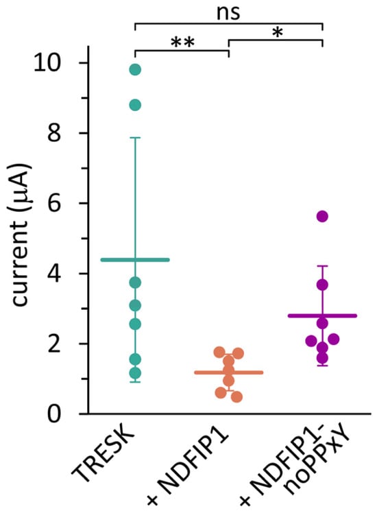 Mutation of PY motifs in NDFIP1 prevented the effect of the adaptor protein on TRESK. K+ currents in three groups of oocytes expressing TRESK, coexpressing TRESK with NDFIP1, or coexpressing TRESK with a mutant version of NDFIP1 lacking PY motifs (NDFIP1-noPPxY), as indicated below the plot. Data are from the same oocyte preparation, n = 7 in all groups. * p < 0.04, ** p < 0.02 with Dunn’s test after Kruskal–Wallis ANOVA, ns: not significant.