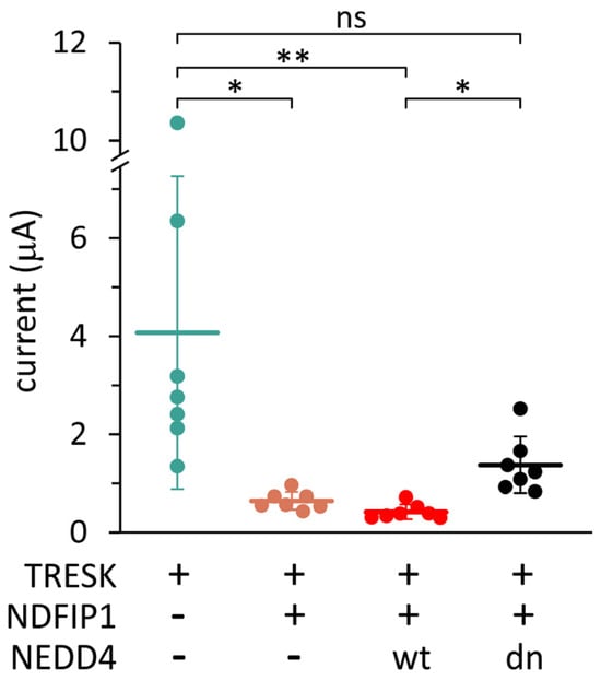 Dominant negative Nedd4 counteracted the NDFIP1-mediated reduction in the TRESK current. K+ currents in four groups of oocytes expressing TRESK, coexpressing TRESK with NDFIP1, or coexpressing wild-type (wt) or dominant negative (dn) Nedd4 with TRESK and NDFIP1 (triple coexpression), as indicated below the plot. Data are from the same oocyte preparation, n = 7 in all groups. * p < 0.015, ** p < 10−4 with Dunn’s test after Kruskal–Wallis ANOVA, ns: not significant.