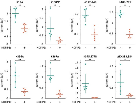 NDFIP1 reduced the K+ current of all the tested lysine-mutant TRESK constructs. The K+ currents in the oocytes expressing the different lysine-mutant TRESK constructs (see above the panels), in the absence or presence of NDFIP1 coexpression, as indicated below the graphs. Data points on the same panel always come from the same oocyte preparation, n = 5–7 in all groups. * p < 0.02, ** p < 0.01 with Mann–Whitney U test. # RFRK motif of TRESK was mutated to NFNN, including the K168N mutation. In the Δ172–248 and Δ188–275 constructs, the appropriate regions were replaced by a lysine-free linker. In the ΔKK383,384 construct, the C-terminal double lysine was deleted.