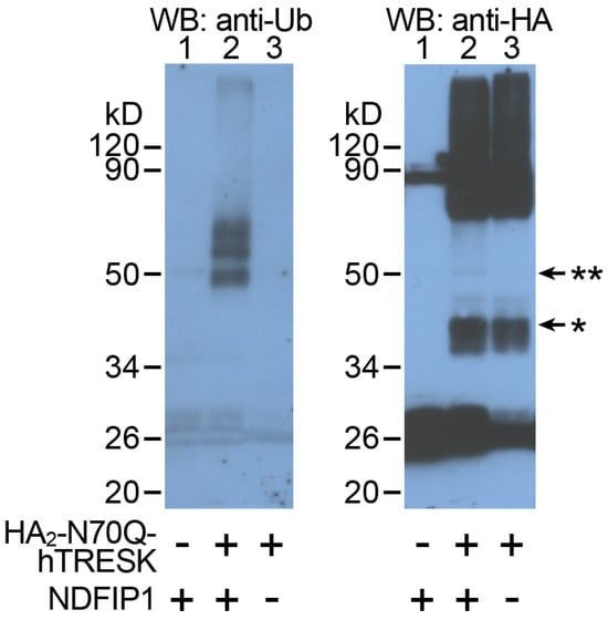 The ubiquitination of the TRESK protein was examined by expressing HA2-N70Q-hTRESK in Xenopus oocytes. This construct contained two influenza hemagglutinin epitope (HA) tags on the intracellular N-terminus of the channel, and the N70Q mutation was introduced to prevent N-glycosylation and heterogeneous migration on SDS-PAGE gels [,]. HA2-N70Q-hTRESK was expressed alone or coexpressed with NDFIP1, or, in a third control group of oocytes, only NDFIP1 was expressed. Crude membrane preparations were produced from these three groups of oocytes by centrifugation (see the Methods section). Afterwards, the phospholipid membranes were solubilized by NP-40 detergent and the HA2-N70Q-hTRESK protein was pulled down with the anti-HA antibody-coated resin of PierceTM HA-Tag IP/Co-IP Kit. The ubiquitination of the channel protein was detected by a standard immunoblot technique, and the same blotting membrane was stripped and reprobed with anti-ubiquitin antibodies after an anti-HA Western blot (Figure 6).