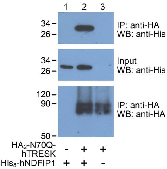 An octahistidine tag was fused to the N-terminus of human NDFIP1, and the interaction of this His8-hNDFIP1 protein with HA2-N70Q-hTRESK was examined. The anti-HA resin pulled down His8-hNDFIP1 only in the presence of HA2-N70Q-hTRESK (see lane 2 in the upper panel of Figure 7), indicating that NDFIP1 was associated with TRESK in the oocytes coexpressing both proteins. This association may be a direct physical interaction or may be mediated indirectly by unknown endogenous components of the oocyte. In the absence of HA2-N70Q-hTRESK, no His8-hNDFIP1 was recovered after the anti-HA immunoprecipitation (lane 1, upper panel), although His8-hNDFIP1 was present in the input before the pull-down reaction (lane 1, middle panel). This excludes the possibility of a non-specific interaction between the anti-HA resin and the NDFIP1 protein. In the absence of His8-hNDFIP1, the pull-down of HA2-N70Q-hTRESK (lane 3, lower panel) did not result in a visible band in the anti-His immunoblot (lane 3, upper panel), verifying the specific detection of His8-hNDFIP1 with the anti-His antibody.