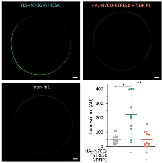 Coexpression of NDFIP1 decreased the immunofluorescence signal of HA-tagged TRESK on the oocyte surface. Three groups of oocytes expressed HA2-N70Q-hTRESK, coexpressed this construct with NDFIP1, or remained as a non-injected control (non-inj), as indicated in the representative images and below the graph. White scale bars indicate 100 μM. Data are from the same oocyte preparation, n = 10 in all groups. * p < 0.02, ** p < 0.005 with Dunn’s test after Kruskal–Wallis ANOVA.