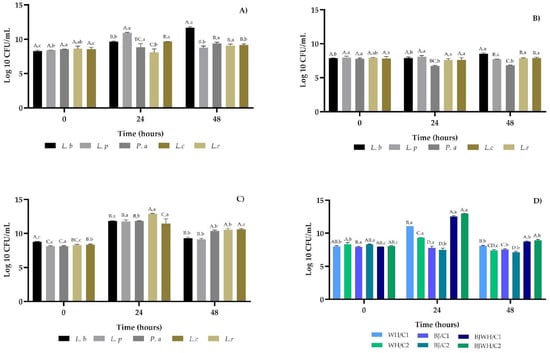 Growth of LAB during fermentation at 0, 24 and 48 h. Individual strains: Levilactobacillus brevis (L. b), Lactiplantibacillus plantarum (L. p), Pediococcus acidilactici (P. a), Lacticaseibacillus rhamnosus (L. r), and Lacticaseibacillus casei (L. c) were inoculated and fermented in WH (whey protein) (A), BJ (blackberry juice) (B), and BJWH (blackberry juice + whey protein) (C). WH/C1 (whey protein inoculated with consortium 1: L. b, L. p and P. a), WH/C2 (whey protein inoculated with consortium 2: L. r and L. c), BJ/C1 (blackberry juice with consortium 1), BJ/C2 (blackberry juice with consortium 2), BJWH/C1 and BJWH/C2 (blackberry juice + whey protein with consortium 1 and 2, respectively) (D). Values represent three experiments’ mean ± standard deviation (n = 3). Different capital letters indicate a significant difference (p < 0.05) between the different strains or consortium for each fermentation time. Different lowercase letters indicate a significant difference (p < 0.05) of each strain or consortium between their different fermentation times.
