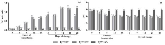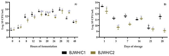 The endpoint of fermentation was assessed by measuring CFU at intervals 0, 4, 8, 16, 20, 24, 28, 32, and 48 h of incubation at 37 °C for BJWH/C1 and BJWH/C2. Figure 2A shows LAB growth, with BJWH/C1 exhibiting a notable increase from 16 h (13.34 ± 0.14 Log 10 CFU/mL) to 28 h (13.85 ± 0.21 Log 10 CFU/mL). However, a decrease in the LAB count was observed at 20 h for both BJWH/C1 and BJWH/C2, followed by variable behavior in subsequent hours, finally resulting in a lower average count (10.27 Log 10 CFU/mL) at 48 h. Consequently, storage analysis was initiated after 16 h of fermentation of the BJWH/C1 and BJWH/C2 samples.