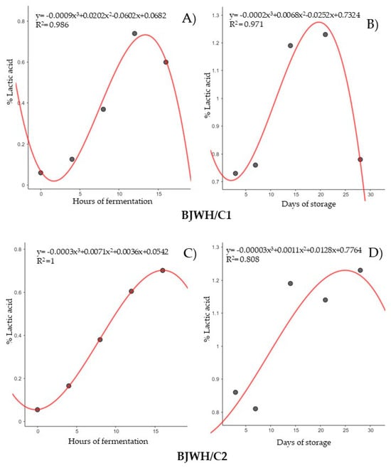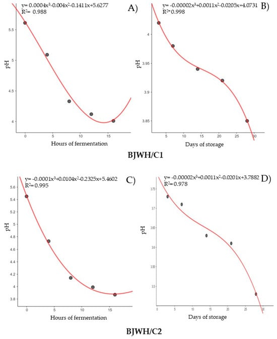 Regression analysis was used to determine the correlation coefficients for lactic acid (Figure 4) and pH (Figure 5) with fermentation and storage time. Data for each factor were modeled with a third-degree polynomial curve. Lactic acid levels increased continuously up to 12 h of fermentation for BJWH/C1 (Figure 4A) and up to 16 h for BJWH/C2 (Figure 4C), with similar trends extending up to 21 days of storage for BJWH/C1 (Figure 4B). Most curves exhibited an R2 value greater than 0.97, except for lactic acid production in BJWH/C2 during storage (Figure 4D), which had an R2 of 0.80. pH levels decreased with extended fermentation or storage time, reflecting their relationship with lactic acid production (Figure 5). This analysis highlights a strong connection between lactic acid and pH, significantly influenced by time.