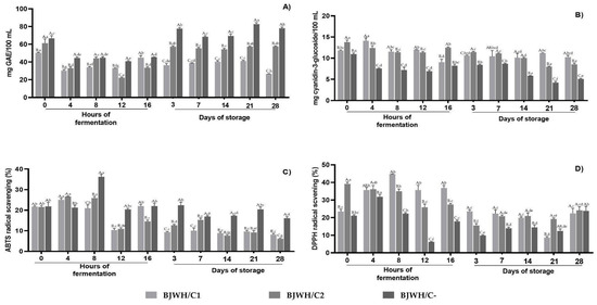 Content of total phenolic compounds (A), anthocyanins (B), ABTS scavenging (C), and DPPH scavenging (D). Values across the time of fermentation (16 h) and the time of storage (28 days) in Blackberry juice + whey inoculated with consortium 1 of Levilactobacillus brevis, Lactiplantibacillus plantarum, and Pediococcus acidilactici (BJWH/C1), consortium 2 of Lacticaseibacillus casei and Lacticaseibacillus rhamnosus (BJWH/C2) and the negative control without LAB inoculum (BJWH/C-). Values represent three experiments with mean ± standard deviation (n = 3). Different capital letters indicate significant differences (p < 0.05) between the different strains or consortiums for each fermentation and storage time. Different lowercase letters indicate a significant difference (p < 0.05) of each strain or consortium between their different fermentation and storage times.