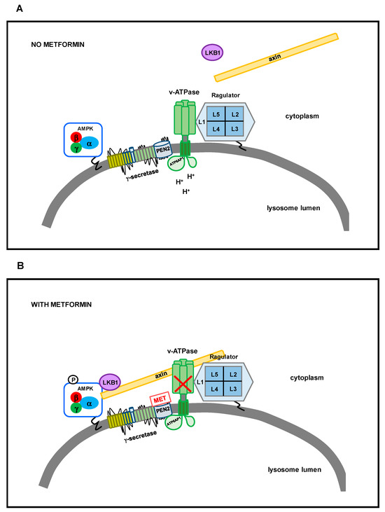 Recently, it has been demonstrated that metformin can interact with the protein presenilin enhancer 2 (PEN2) on the lysosome surface [12]. PEN2 is a regulatory subunit of γ-secretase, a transmembrane proteolytic complex involved in the production of amyloid β-peptide in Alzheimer’s disease [53].