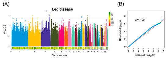 Manhattan (A) and Q–Q (B) plots of leg disease at the genome-wide level.