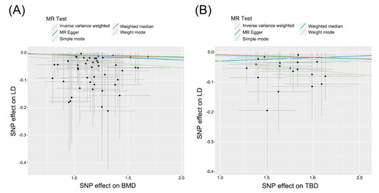Scatter plots for MR analyses of the causal effect of (A) BMD and (B) TBD on LD. BMD: bone mineral density; TBD: tibial bone diameter; LD: leg disease.