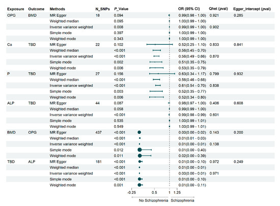 When Ca, P, ALP, and OPG were considered as outcome variables, and BMD and TBD as exposure factors, the same methodology was applied, incorporating 437 SNPBMD and 181 SNPTBD, resulting in a total of 618 SNPs used as IVs for MR analysis. MR analysis revealed significant associations between serum levels and the risk of bone damage. According to the IVW results, decreased BMD (OR = 0.0078, 95% CI = 0.0043–0.0140, P < 0.001) emerged as a risk factor for elevated serum OPG levels, while TBD exhibited a strong negative association with serum ALP (OR = 0.0046, 95% CI = 0.0026–0.0083, P < 0.001). Notably, the Cochran Q test using IVW detected no evidence of heterogeneity, and the MR–Egger intercept test indicated no presence of pleiotropy (Figure 3). Moreover, the sensitivity analysis employing the “leave-one-out” approach demonstrated that the causal associations between bone traits and serum indicators were not affected by any single SNP, confirming the validity and reliability of the analysis.