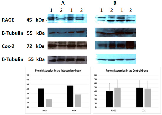 Protein expression of RAGE and COX-2 (Western Immunoblotting)—indicative images. Effect of intervention on RAGE and COX-2 protein expression in PMBC cells of patients. The protein expression level was measured by Western blot analysis at baseline, and one month after dietary intervention in equal amount of cell lysate (40 lg/lane) from isolated PMBC cells of each participant. Cell lysates was subjected to electrophoresis and analyzed by Western blot. Representative blots shown for each studied protein. (A). Intervention group (B). Control group. 1. Baseline 2. After intervention.