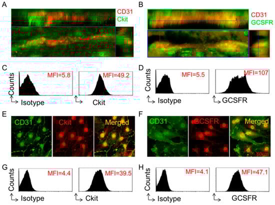 To determine and validate the expression of receptors for SCF and G-CSF on brain endothelial cells, we performed immunofluorescence staining and flow cytometric analysis on adult mouse brain tissue and mouse brain-derived endothelial cells. Immunofluorescence staining of brain sections revealed that the SCF receptor (Ckit) and G-CSF receptor (GCSFR) were co-localized with CD31+ endothelial cells in the cortex (Figure 1A,B). Flow cytometry analysis showed the mean fluorescence intensity (MFI) of Ckit as 49.2 and GCSFR as 107 on CD45−CD31+ gated primary endothelial cells isolated from the adult mouse brain (Figure 1C,D). In addition, we found that both Ckit and GCSFR were expressed on bEnd.3 cells (an endothelial cell line derived from the mouse brain), which was confirmed by both immunofluorescence staining (Figure 1E,F) and flow cytometry (Figure 1G,H). These validated data demonstrate that the receptors for SCF and G-CSF are constitutively expressed on endothelial cells, suggesting that SCF and G-CSF might have important biological functions in these cells.