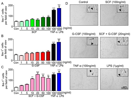 Next, we determined whether G-CSF alone has similar effects on enhancing endothelial cell/monocyte adhesion. Surprisingly, G-CSF alone did not show significant changes in the adhesion of Iba-1+ monocytes to endothelial cells at any tested dosage (Figure 2B,D). In contrast, in the positive controls, significantly increased numbers of monocytes adhering to bEnd.3 cells were observed following a 16-h pre-treatment with 100 ng/mL TNF-α (p < 0.001) or 1 µg/mL LPS (p < 0.001) compared to the medium controls (Figure 2). These experiments were repeated four times with similar results.