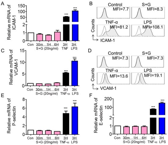 Under inflammatory conditions, many adhesion molecules are expressed in endothelial cells; these adhesion molecules play a critical role in the rolling, adhesion, and migration of leukocytes across the vascular endothelial barrier [,]. Here, we used real-time qPCR and flow cytometry to determine whether SCF+G-CSF increases the expression of adhesion molecules in endothelial cells. We observed that the gene expression levels of vascular cell adhesion molecule-1 (VCAM-1, CD106), intracellular adhesion molecule-1 (ICAM-1, CD54), P-selectin, and E-selectin were markedly upregulated in bEnd.3 cells after 3 h treatment with the inflammatory mediators TNF-α and LPS (p < 0.001) (Figure 3). However, SCF+G-CSF treatment did not significantly change the gene expression levels of ICAM-1, VCAM-1, P-selectin, and E-selectin in bEnd.3 cells (Figure 3). Flow cytometric analysis of ICAM-1 and VCAM-1 expression on bEnd.3 cells was consistent with the results from real-time qPCR (Figure 3B,D). These findings suggest that the SCF+G-CSF-enhanced adhesion function of vascular endothelial cells is mediated through a pathway distinct from inflammatory signaling.