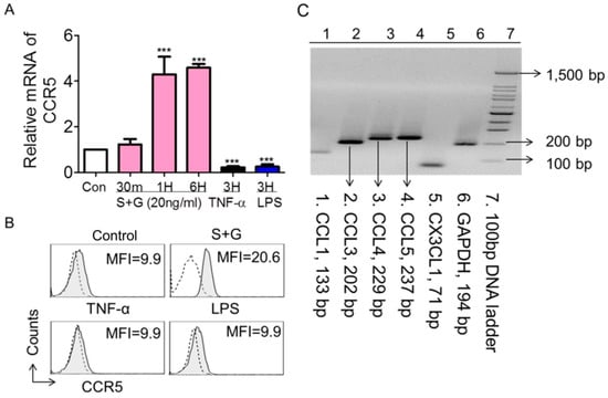SCF+G-CSF increases CCR5 expression on bEnd.3 endothelial cells. (A) Quantitative real-time PCR data showing mRNA expression of CCR5 in bEnd.3 endothelial cells cultured for different periods (30 min to 6 h) in the presence of medium alone (con: control), SCF+G-CSF (20 ng/mL), TNF-α (100 ng/mL), and LPS (1 µg/mL). Mean ± SEM. *** p < 0.001 vs. medium control. One-way ANOVA followed by post hoc Tukey’s test. (B) Representative flow cytometry histograms showing membrane expression of CCR5 on bEnd.3 endothelial cells. MFI: Mean fluorescence intensity. Repeated experiments, n = 5. Dashed lines indicate isotype IgG controls. Filled gray lines represent specific staining for CCR5. (C) PCR-electrophoresis showing mRNA expression of CCL1 (133 bp), CCL3 (202 bp), CCL4 (229 bp), CCL5 (237 bp), and CX3CL1 (71 bp) in Iba-1+ monocytes.