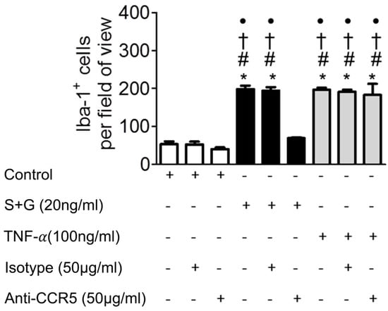 Anti-CCR5 antibody blocks SCF+G-CSF-enhanced monocyte adhesion to endothelial cells. Monolayers of mouse brain-derived endothelial cells (i.e., bEnd.3 cells) were incubated in the presence of medium alone (control), SCF+G-CSF (20 ng/mL), and TNF-α (100 ng/mL) for 16–18 h. After washing, the bEnd.3 cells were pre-treated with anti-CCR5 antibody or isotype IgG control antibody before adding Iba-1+ monocytes to the bEnd.3 cell monolayers. Mean ± SEM. N = 7. * p < 0.001 vs. medium control, # p < 0.001 vs. medium control with isotype control, † p < 0.001 vs. medium control with anti-CCR5, and • p < 0.001 vs. S+G with anti-CCR5. One-way ANOVA followed by post hoc Tukey’s test.