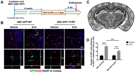 To verify that SCF+G-CSF treatment increases blood cell adhesion to endothelial cells under physiological conditions in vivo, we created UBC-GFP+ bone marrow chimeric CCR5−/− and wild-type (WT) mice (i.e., UBC-GFP-CCR5−/− mice and UBC-GFP-WT mice). In these mice, we examined the adhesion of bone marrow-derived cells (GFP-positive) to cerebral endothelial cells (CD31-positive) after SCF+G-CSF treatment (experimental flow chart, Figure 6A). We observed that SCF+G-CSF treatment increased bone marrow-derived GFP+ cell adhesion to CD31+ endothelial cells in the cerebral cortex of both UBC-GFP-WT mice and UBC-GFP-CCR5−/− mice compared to the vehicle control groups (p < 0.001). However, the number of GFP+ cells adhering to endothelial cells was significantly lower in SCF+G-CSF-treated UBC-GFP-CCR5−/− mice than in SCF+G-CSF treated UBC-GFP-WT mice (p < 0.001) (Figure 6). These findings suggest that SCF+G-CSF-enhanced adhesion of bone marrow-derived blood cells to brain endothelial cells is, at least partially, mediated through CCR5.