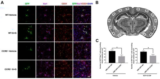 To identify whether CCR5 modulates bone marrow-derived monocyte transmigration into the brain via SCF+G-CSF treatment, we quantified the number of GFP+/Iba1+ cells surrounding the CD31+ endothelial cells in the cortex (surrounding: within 10 μm from vessels). In the vehicle control mice, the number of GFP+/Iba1+ cells surrounding the blood vessels in the cerebral cortex was significantly reduced in CCR5 knockout mice compared to WT mice (p < 0.05) (Figure 7). Similarly, in the SCF+G-CSF-treated mice, the number of GFP+/Iba1+ cells surrounding the blood vessels in the cortex was significantly decreased in CCR5 knockout mice compared to WT mice (p < 0.05) (Figure 7). These data suggest that CCR5 is involved in the transmigration of Iba1+ bone marrow-derived monocytes into the brain and that CCR5 is required for SCF+G-CSF-enhanced transmigration of blood monocytes into the brain. Interestingly, GFP+/Iba1+ cells were found only around, but not inside, the lumen of CD31+ brain vessels, indicating that monocytes may differentiate into Iba1+ macrophages immediately after transmigrating from the blood vessels into the brain.