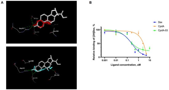 The affinity of CpdA-03 to GR proposed by virtual docking (Figure 2A) and confirmed by radioligand binding assay. For this purpose, CpdA-03 was tested in a concentration range of 0.001–10 µM. We demonstrated that binding IC50 for the reference GR ligands Dex and CpdA were 0.23 µM and 2.5 µM, respectively, which is in line with the literature data [,,], confirming the accuracy of our results. CpdA-03 showed a relative binding affinity to GR with an IC50 value of 0.15 µM (Figure 2B). The obtained data indicate that CpdA-03 affinity was higher compared to the original compound and therefore is a promising agent for further detailed studies.