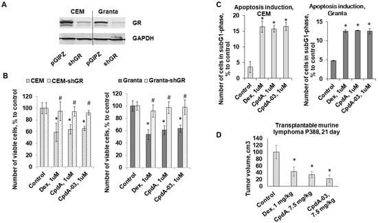 Anti-cancer activity of CpdA-03 in vitro and in vivo. GR knockdown in CEM and Granta cells was confirmed by Western blot analysis (A). CEM, CEM-shGR, Granta, and Granta-shGR cells were treated with a solvent (control), Dex, CpdA, or CpdA-03 (each used at 1 µM) for 24 h, and their effects on cell growth (B) were estimated by cell counting. Apoptosis levels (C) were assessed by flow cytometry using propidium iodide staining (the number of cells in the sub-G1 phase was calculated as a percentage of the entire cell populations). (D) In vivo anti-cancer activity was evaluated using the transplantable P388 murine lymphoma model. Animals were treated i.p. 3 times per week with Dex (1 mg/kg), CpdA (7.5 mg/kg), CpdA-03 (7.5 mg/kg), or the vehicle (5% DMSO in PBS). Tumor nodule size was measured twice a week by digital calipers. * Statistically significant difference (p < 0.05) compared to control, # statistically significant difference (p < 0.05) between control cells and GR-knockdown cells treated with the same agent.