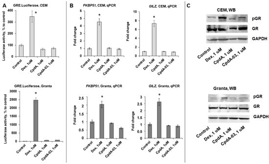 To assess the effect of CpdA-03 on GR TA function, we used CEM and Granta cells transduced with the GRE.Luc reporter. Dex and CpdA were used for comparative analysis. In contrast to Dex, neither CpdA-03 nor CpdA induced GRE Luciferase activity in either cell line (Figure 4A). Attenuation of GR TA was further confirmed by Q-PCR analysis of the known GR-target genes, including FKBP51, encoding the GR chaperone [,], and GILZ, which mediates GC anti-inflammatory effects [,] (Figure 4B), as well as by Western blot analysis of the phosphorylated GR (Ser211) content (Figure 4C).